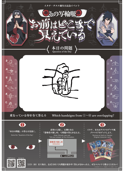 うちは兄弟の誕生日をお祝いし、イタチの誕生日である6月9日からサスケの誕生日である7月23日までの期間限定で開催される解読イベント。アトラクション入口に掲示される複数重なりあった印を読み解くゲームに挑戦し、見事に読み解いた方には、「NARUTO&BORUTO 忍里」限定のゲマキ風オリジナルブロマイド「サスケ」と「イタチ」から、お好きな方をプレゼント