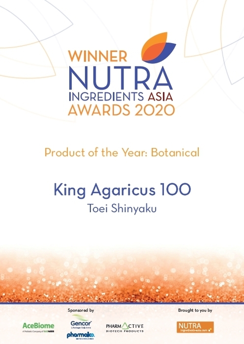 表彰の対象は、「アジア太平洋地域で最高のサプリメントと機能性食品、成分、研究」となります。授賞式は、2020年9月22日にNutraIngredients-Asia.com上でバーチャルイベントとして開催されました。賞は世界中の企業に門戸を開いており、製品または成分の少なくとも1品がAPAC(アジア太平洋)市場で利用可能であることを条件としています。表彰は14のカテゴリーに分かれており【キングアガリクス100(King Agaricus 100)】は、日本国内での販売実績と、これまでに発表した論文数を審査員に高く評価され、「Product of the Year - Botanical」を受賞しました。