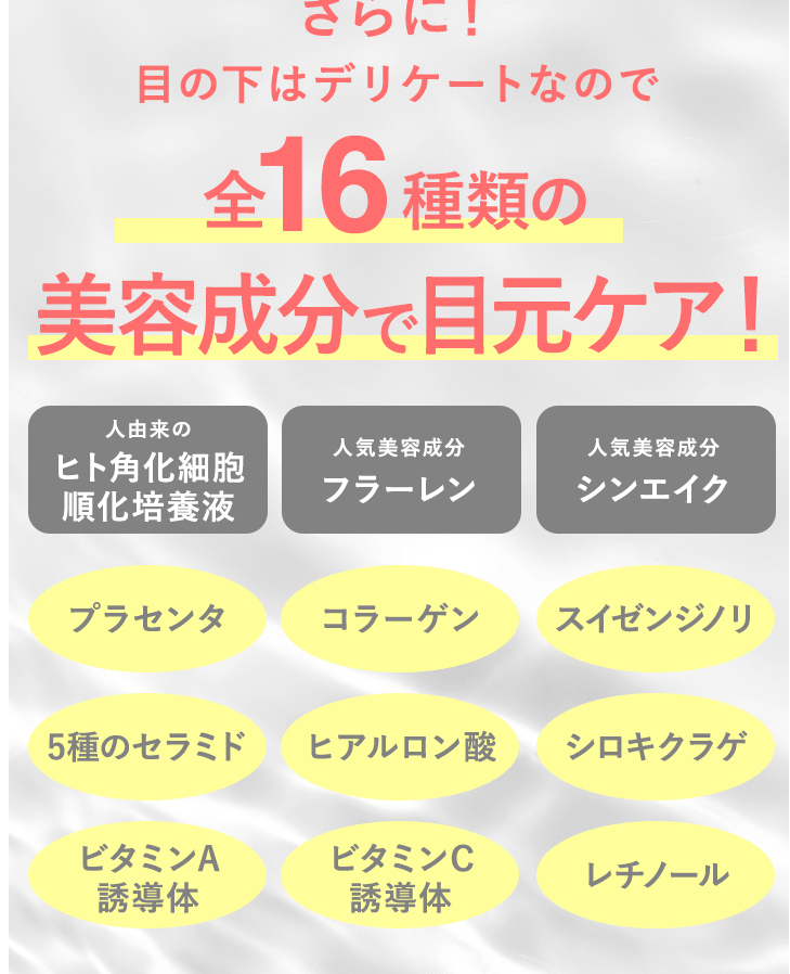 ●さらに!!16種類の美容成分を配合!ヒト角化細胞順化培養液、フラーレン、シンエイク、レチノール、プラセンタ等のアイクリーム級の美容成分がたっぷり!
