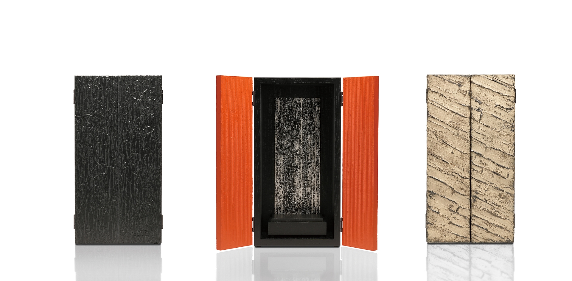 主材料は木と漆ですが、漆は会津で長年育てた国産“黒森漆”を使用し、また新しく樹脂乾漆技法表現を用いました。今回は厨子屋の運営元である仏壇・仏具メーカーのアルテマイスターと共同開発した厨子、「時跡」も発表いたします。併せてご覧ください。」十時 啓悦