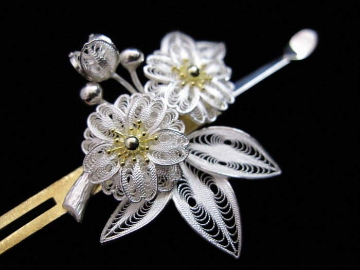 日本の代表である桜をモチーフとしたかんざしです。桜の花と蕾、葉を純銀の銀糸で織りなし、桜の花弁部分を純金と18Kで華やかにまとめています。