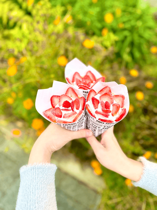 試作にとりかかると、なかなか上手く巻けず試行錯誤することになりました。クレープにいちごを入れて巻いてもまったく映えず、考えた末に巻いた後にスライスしたいちごをバラの花びらみたいにクリームの上に乗せてみようという発想にたどり着きました。そして、ブーケのように透明フィルムで包装すると、かわいくて映えるクレープと女性たちの間で大人気となりました。
