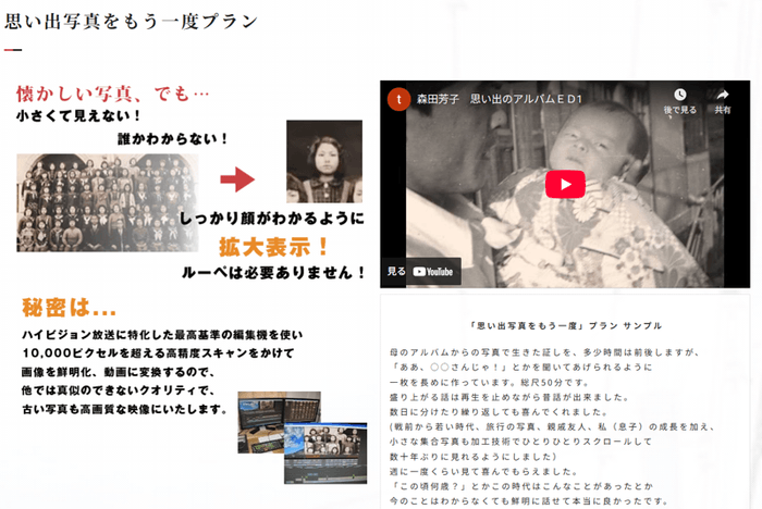 1枚しか残っていない写真をお預かりして、古い写真も可能な限り鮮明にして動画にまとめて納品いたします。(時系列に並べていただけると幸いです。)