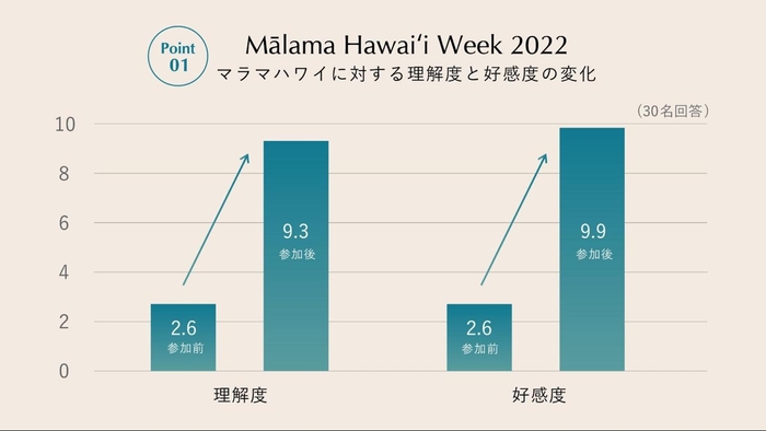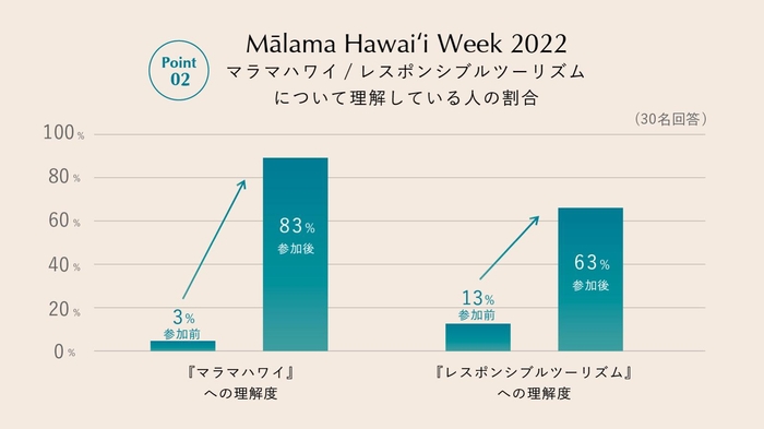 ハワイ州観光局 日本支局(所在地:東京都千代田区 支局長:ミツエ・ヴァーレイ)は、株式会社TABIPPO(東京都渋谷区 / 代表取締役社長 清水直哉)と協力して、Z・ミレニアル世代を対象としたハワイの魅力とレスポンシブルツーリズムの大切さを伝えることを目的としたキャンペーン「Mālama Hawaiʻi Week 2022(マラマ ハワイ ウィーク 2022)」を10月14日から実施した結果、50名がマラマなハワイ体験ができるモニターツアー&イベントに参加し、マラマハワイに関する1000を超えるUGC(ユーザー生成コンテンツ)を創出しました。またモニターツアー参加者の意識調査結果では、マラマハワイの理解度と好感度が高まり、新しいハワイの観光のあり方が好意的に受け入れられたことが分かりました。