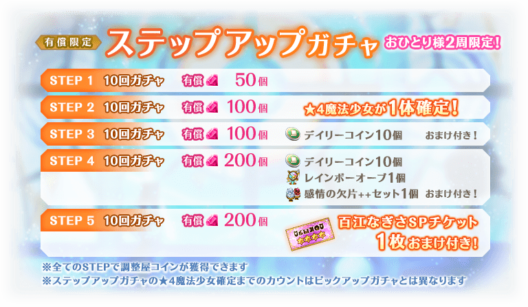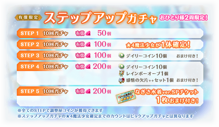 ※STEP2での★4魔法少女について、ピックアップ対象の魔法少女が確定するわけではございません。