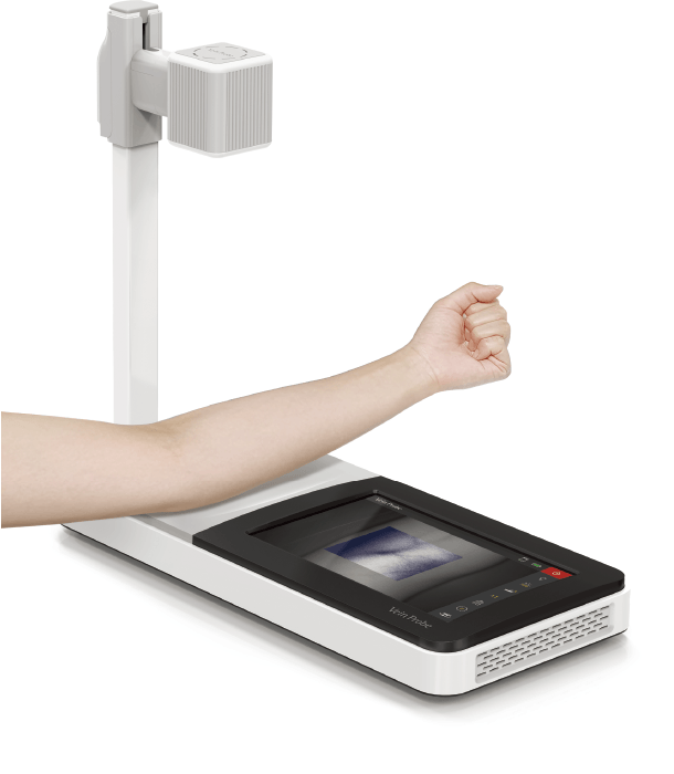 「静脈可視化装置 Vein Probe VPism-C+」は、皮膚に近赤外線(波長850nm)を非接触的に照射し、その反射光から表在静脈の位置をディスプレイに表示します。本品は、目的部位の静脈を非接触的に視覚化することにより医療従事者の検査、処置等を支援する医療用補助装置です。