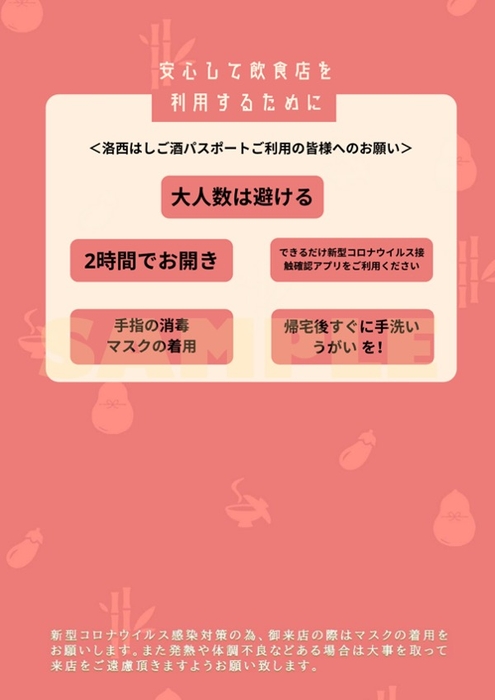 洛西はしご酒パスポート裏面に、飲食店に伺う際の感染症対策やお開きの基準、人数の制限などを記載し、パスポートを確認することでお客様自身にご配慮頂くようにお願いしています。
