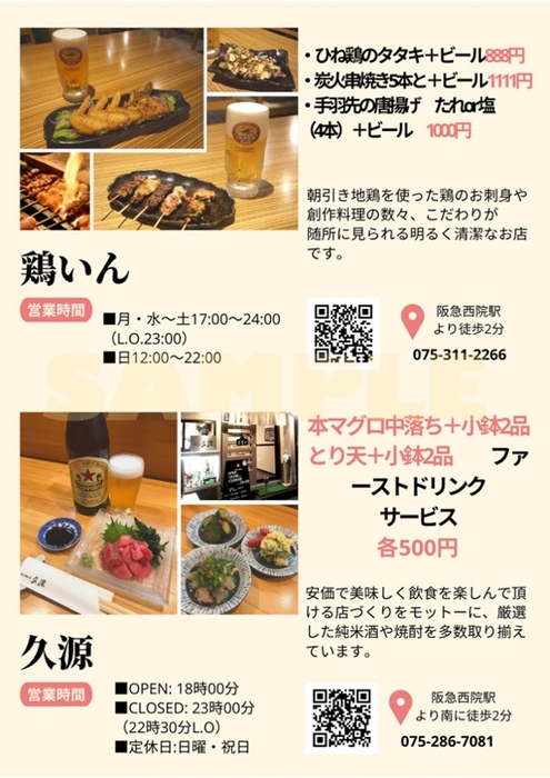 洛西はしご酒パスポート内には、各店舗が特別価格で用意する「洛西はしご酒パスポート専用メニュー」が掲載されています。購入者限定で注文できる仕組みとなっており、通常時に御飲食いただくより10%~30%お安くなる値段設定となっています。