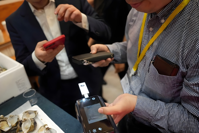 会場で大きな注目を集めたのは牡蠣でした。宇宙養殖の観点から、宇宙で牡蠣を育てて米関連の粒子を牡蠣に吸わせる実証例として、米麹を牡蠣に取り込ませる様子が展示されていました※1。また、牡蠣に合うお酒として、津南醸造の『郷(GO) dolce』などがふるまわれました。