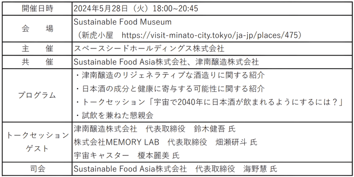 スペースシードホールディングス株式会社(本社:東京都港区、代表:鈴木健吾、以下「スペースシードホールディングス」)は、Sustainable Food Asia株式会社と津南醸造株式会社との共催で、2024年5月28日(火)に虎ノ門で、日本酒と健康の関係性を考えるイベント「Sustainable Sake NIGHT 2024」を開催したことを報告します。