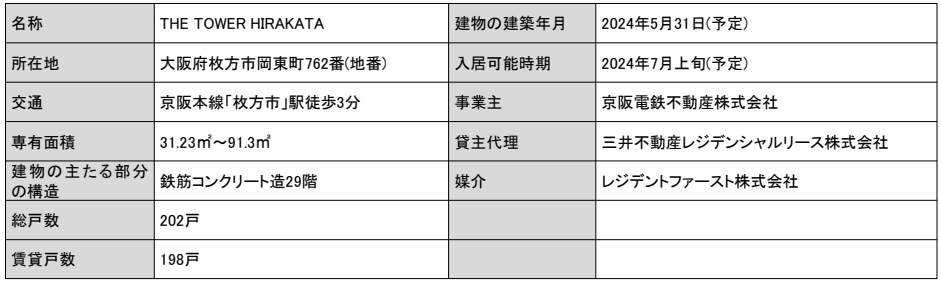 京阪ホールディングス株式会社(本社:大阪市中央区、社長:石丸昌宏)、京阪電気鉄道株式会社(本社:大阪市中央区、社長:平川良浩)、京阪電鉄不動産株式会社(本社:大阪市中央区、社長:道本能久)が、組合員の一員として、かねてより参画しております枚方市駅周辺地区市街地再開発組合(理事長:宮田 明)の進める、枚方市駅周辺地区第一種市街地再開発事業(以下、「再開発事業」)において、京阪電鉄不動産株式会社が取得する賃貸タワーレジデンス「THE TOWER HIRAKATA」(以下、本物件)が、2024年5月31日(金)に竣工いたしますので、お知らせいたします。