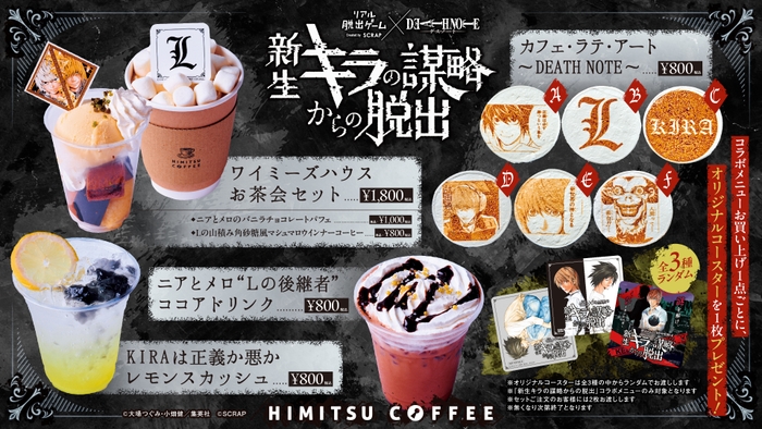 オリジナルメニューは『新生キラの謀略からの脱出』の東京会場である「東京ミステリーサーカス」1F 「HIMITSU COFFEE」にて、イベント開催期間である2024年10月3日(木)~12月22日(日)の期間限定で販売。期間中はオリジナルメニューを1点お買い上げごとに、オリジナルデザインのコースター3種の中から1点、ランダムでプレゼントいたします!