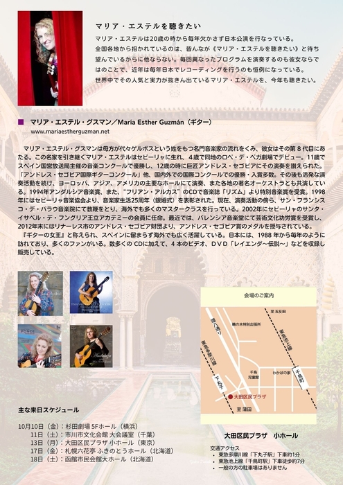 プリマベーラ主催、『ギターの女王』マリア・エステル・グスマン ツアーが2025年10月10日 (金)に横浜市磯子区民文化センター杉田劇場 5Fホール(神奈川県 横浜市磯子区 杉田 1-1-1)にて、2025年10月13日 (月・祝)に大田区民プラザ 小ホール(東京都 大田区 下丸子 三丁目1番3号)にて開催されます。