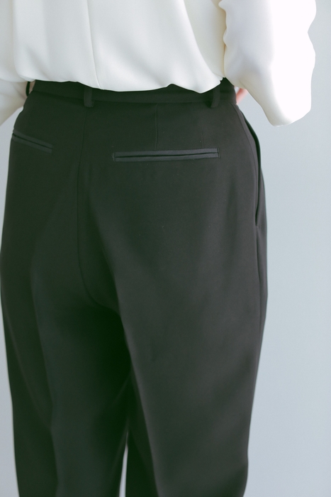 ジャケットは、トレンドのボックスシルエットと長めの着丈に、アームホールと肩幅を広くとった窮屈感のないデザインです。上衿部分のサテン切り替えが印象的で、深めの内ポケットも嬉しいポイント。パンツはジャケットのシルエットに合わせ、ゆとりを持たせたツータック仕様のストレートラインです。ヒップポケットに施した、ジャケット同様のサテン切り替えがさりげないアクセントに。また、表地の適度な光沢感となめらかなドレープが高級感を演出します。着心地の良さとマニッシュかつ艶のあるセットアップスーツに仕上がっています。