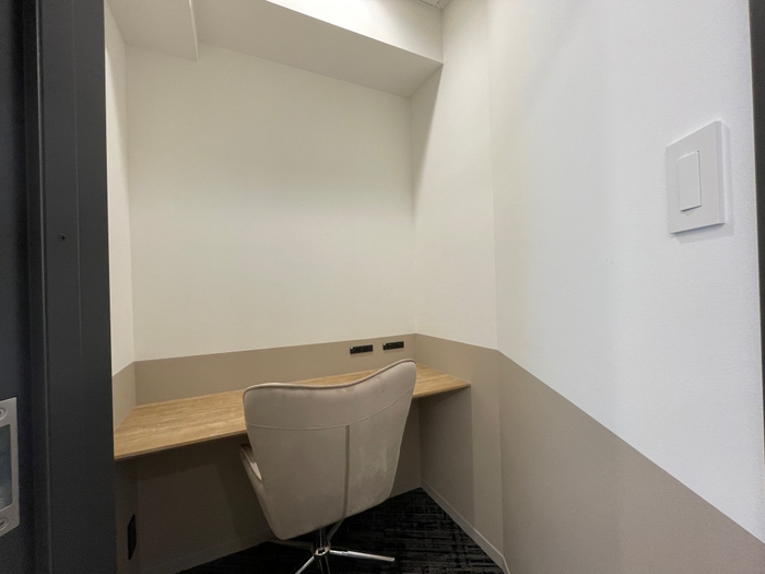 エレベーターを降りて正面に受付モニター台とその先には執務室、右手に4名掛け会議室と男女別トイレがあります。執務室は天井が抜けたホワイトスケルトン。天高は3.1mと開放感があります。床壁は綺麗に貼ってあるので家具を入れればそのまま入居できます。室内にはzoom会議や集中作業に最適なテレカンブース1室つき。
