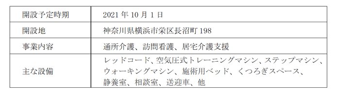 上記施設を含め、当社が展開する通所介護施設は、直営・フランチャイズ含めて30カ所、訪問看護ステーションは2カ所、居宅介護支援事業所は1カ所となります。