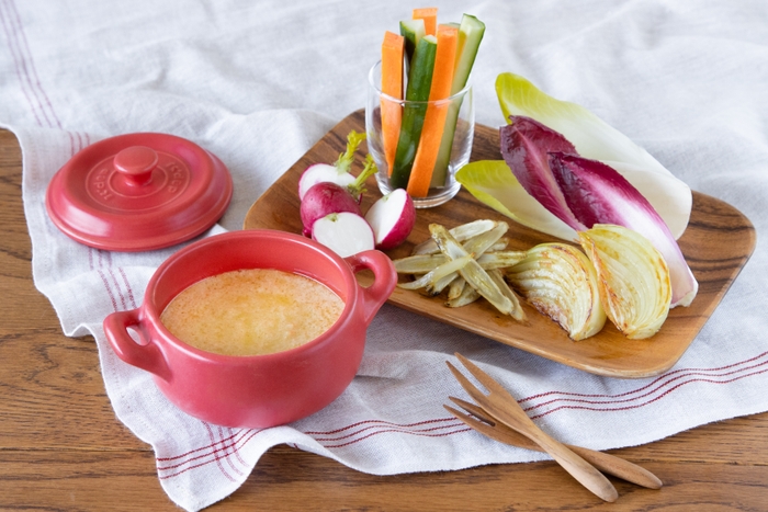 通常はアンチョビを使うことが多いですが、発酵食品の味噌を使って手軽に。水溶性食物繊維(イヌリン)が豊富なにんにくを使用し、かける野菜でチコリなどを使っています。サラダにそのままかけるも良し、ディップして食べるも良しの万能ドレッシングです。