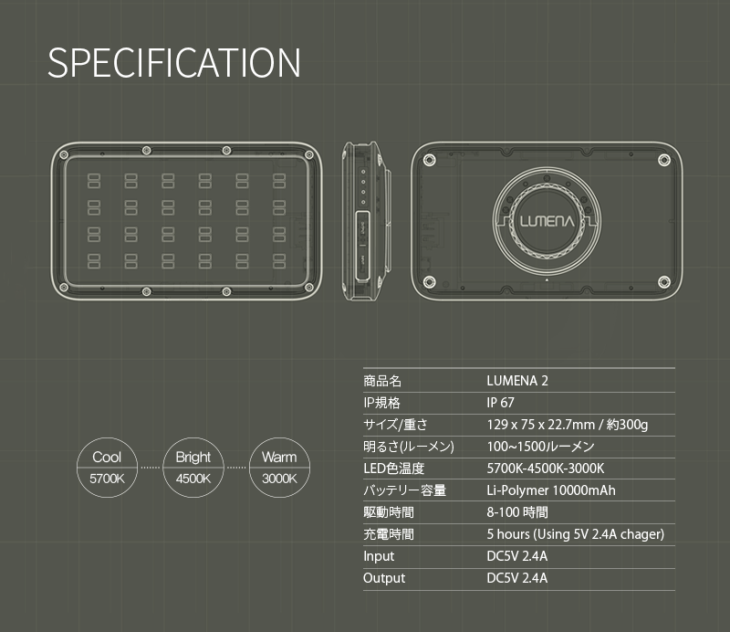 10,000mAhの高容量で、モバイル機器を充電しながら照明としてご使用いただけます。