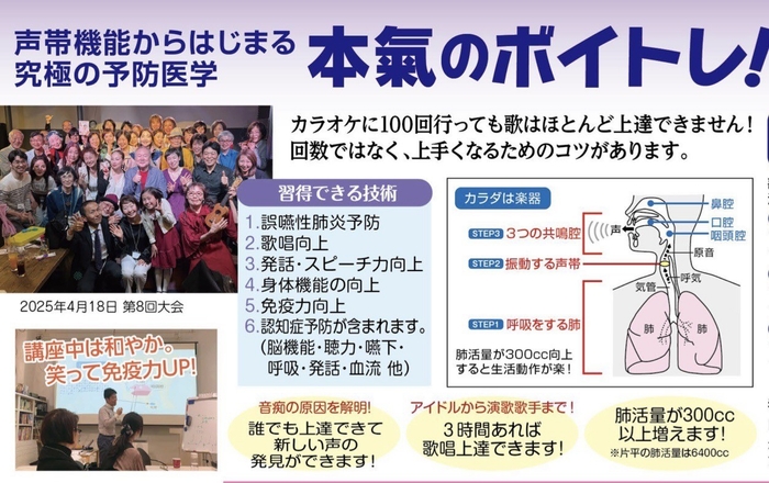 「本氣のボイトレ」は、単なる発声練習や歌唱力アップのためのトレーニングにとどまらず、肺・声帯・共鳴腔の協調を高め、健康寿命の延伸を目指す次世代型プログラムです。