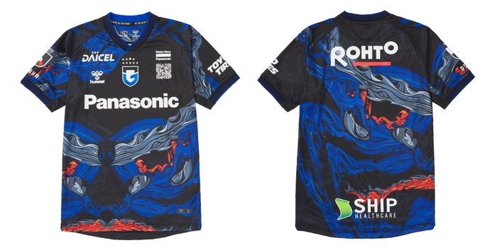 今年のEXPOのテーマは、「∞(無限)」。GAMBA EXPOを機にファンやサポーター、ホームタウン、パートナー企業に様々な面から無限の可能性を生み出したいという想いを込めたものになっています。『テーマを具現化したユニフォームは、チームにとって一番の「顔」となる』と考えたデザイナー田村大さんが、戦う姿勢と迫力を青、黒、赤の炎を歌舞伎の化粧法である隈取りで形成。際立った所作をする大見得を切るイメージにGAMBA EXPO 2024のコンセプト「無限」を掛け合わせました。