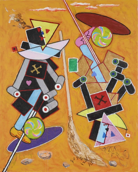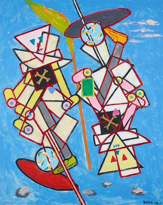 本作品は、当館表慶館において2023(令和5)年9月12日から12月3日まで開催された「横尾忠則 寒山百得」展で展示されたものです。この展覧会では、横尾氏が東洋、日本の伝統的な絵画テーマである寒山拾得を、独自の解釈で再構築した「寒山拾得」シリーズの完全新作102点を一挙に公開しました。