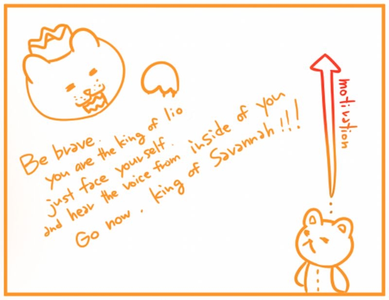 “恐れるな、、、お前はライオンの王の中の王。(注:実際はクマ)自分自身と向き合い、心の奥から湧き出る声をきけばよい。行け!サバンナの王よ!!!!(注:王ではなくクマ)”