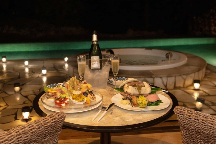 36万坪の敷地内にある60室の客室の中で最も広い95平米の客室、「ロイヤルスイート」に宿泊します。客室にはプライベートプールやジェットバスやサウナを完備。全てを調和した客室で、心地よい風を感じながらラグジュアリーなひと時を過ごすことができます。ミニバーには泡盛やビールなど地元のお酒を用意。プライベート感溢れる客室にて贅沢な時間を過ごすことができます。