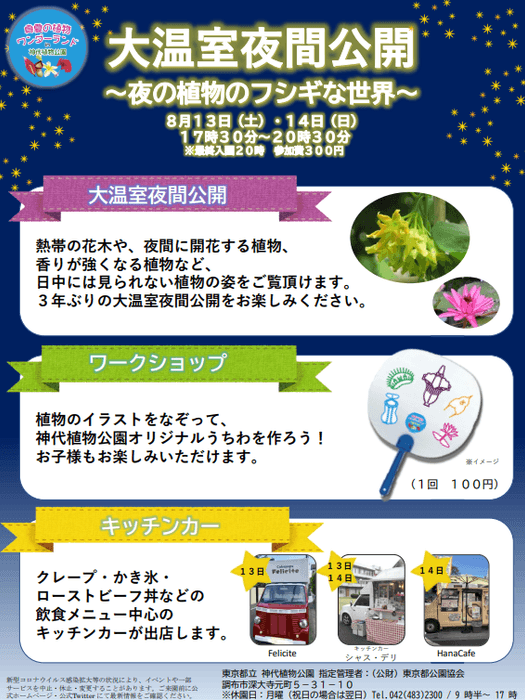3年ぶりの大温室夜間公開のほか、ワークショップやキッチンカー出店もございます。