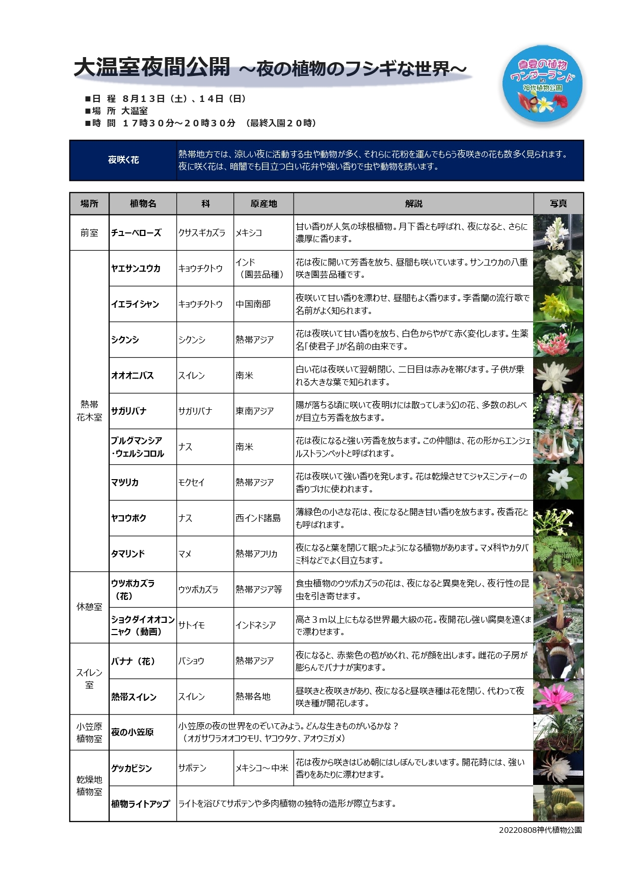 ※「大温室夜間公開」は「真夏の植物ワンダーランド in 神代植物公園」のイベントの一部として開催しております。