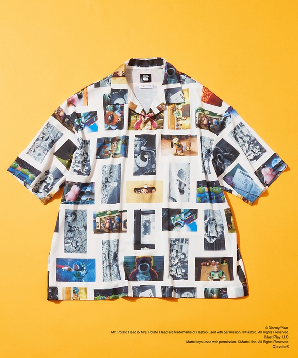 ディズニーとピクサー作品のシーンをコラージュし総柄プリントしたシャツ。