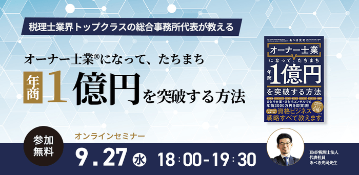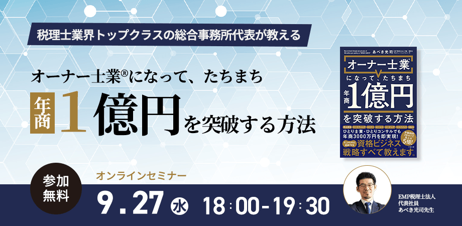 税理士業界トップクラス(上位0.5%)の総合事務所代表”あべき光司”先生新刊『オーナー士業®になって、たちまち年商1億円を突破する方法』発売記念【無料】オンラインセミナー9月27日(水)18時より開催!