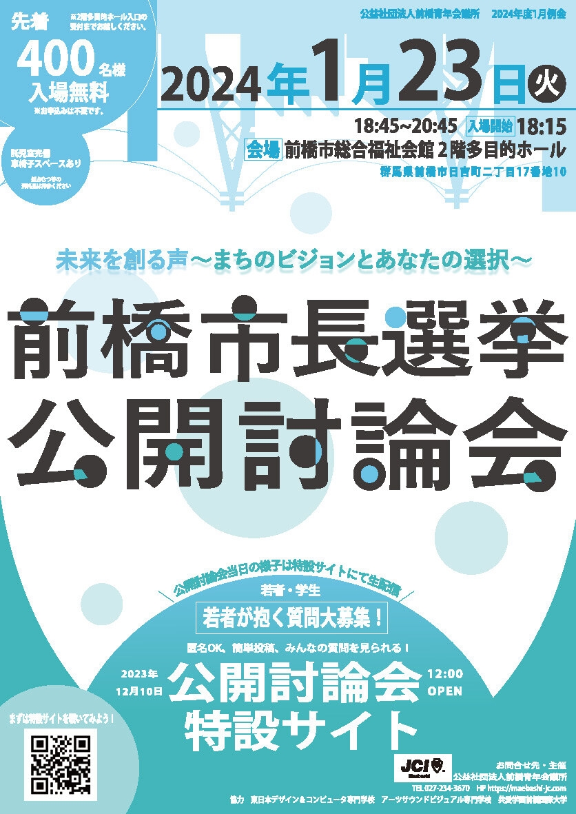 公益社団法人前橋青年会議所(群馬県前橋市日吉町1-8-1 マックスクエア4F、2024年度 理事長:西川 裕志)、2024年度 理事長:西川 裕志)は「前橋市長選挙公開討論会 未来を創る声~まちのビジョンとあなたの選択~」を2024年1月23日(火)に開催します。