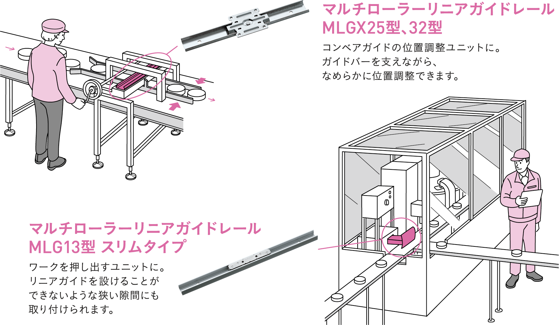 新製品は、2点掲載しています。X状に交差する8つのローラー配列であらゆる方向の荷重を受けてもスムーズに動き、従来品より高荷重化した「MLGX32」、コンパクトかつMCナイロン採用の樹脂ローラーガイドレール「MRG30」です。