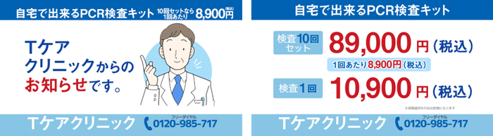 「全国どこでもご自宅で・唾液採取のみ・結果はメールでお知らせ」と非常に便利なTケアクリニックのPCR検査キット(宅配)が、1回10,900円、10回セット89,000円(1回あたり8,900円)にて提供されることを訴求した内容となっております。(保険適用外の自由診療になります。)