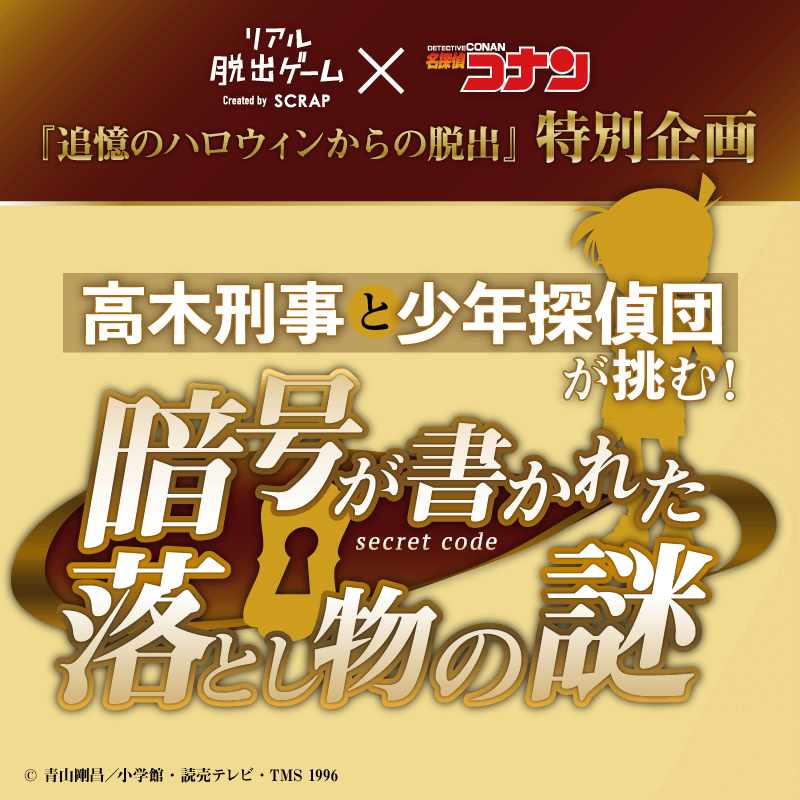 株式会社SCRAP(本社:東京都渋谷区 代表:加藤隆生)は、大人気テレビアニメ「名探偵コナン」とコラボレーションしたリアル脱出ゲーム『追憶のハロウィンからの脱出』特別企画として、誰でも挑戦できる無料の謎解き企画『高木刑事と少年探偵団が挑む! 暗号が書かれた落とし物の謎』を開催いたします。