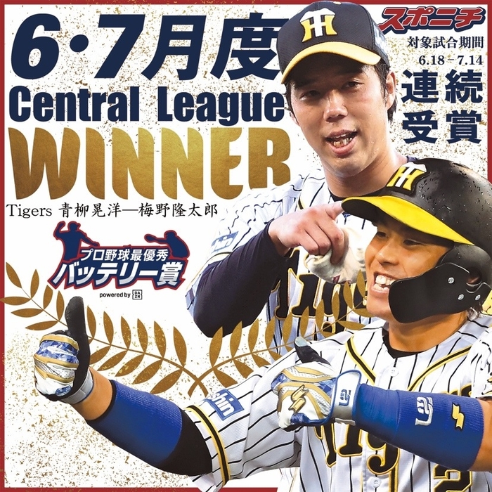 株式会社スポーツニッポン新聞社(本社:東京都江東区、代表取締役社長:小菅洋人、以下スポニチ)とスポーツ動画配信サービスのDAZN(ダゾーン)は9日、「2021プロ野球最優秀バッテリー賞 powered by DAZN」の7月度月間賞(対象期間は6月18日~7月14日)を下記の通り発表しました。DAZNの公式Twitter(@DAZN_JPN)でのファン投票の結果、セ・リーグからは阪神・青柳晃洋投手(27)と梅野隆太郎捕手(30)、パ・リーグからはソフトバンク・マルティネス投手(31)と甲斐拓也捕手(28)のバッテリーが選出されました。
