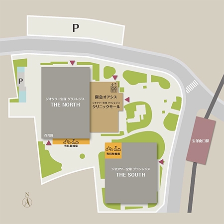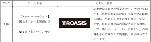 本施設には、1階にスーパーマーケット「阪急オアシス宝塚南口店」、2階~4階にクリニックモール「ジオタワー宝塚 グランレジス クリニックモール」が入居します。