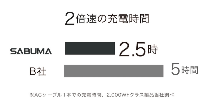 独自のデュアルコンバーター技術を開発することで2,258Whという大容量ながら、わずか2.5時間でフル充電できるため、急な利用にも対応できます(はじめの1時間で60%の充電が可能)。
