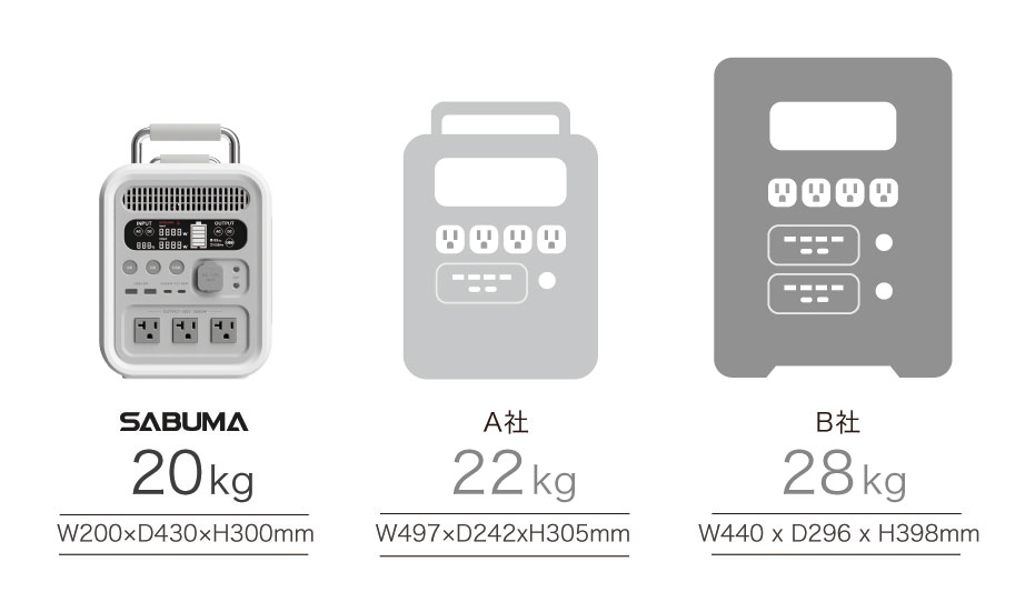 S2200は、電気自動車(EV)でも採用されるBMS(バッテリーマネジメントシステム)、Smart Ventilation System(自律制御放熱システム)などの高度なバッテリー安全性制御技術を開発・採用することで、クラス最小レベルのコンパクトな筐体ながら、2,258Wh / 2,000Wという大容量・大出力のポータブル電源を実現しています。 2,258Wh / 定格出力2, 000WのSABUMA S2200は、例えば50インチテレビを18時間、小型冷蔵庫を50時間以上、電子レンジを連続2時間以上使用できるほどのハイスペックである為、キャンプや車中泊などのレジャー用途だけでなく、災害等による停電時のバックアップ電源としてや、屋外作業を伴うさまざまな業務用途としても十二分に長時間お使いいただくことが出来ます。 それだけのハイスペックでありながら、人に優しい流麗でシンプルなデザインは、さまざまな人々の暮らし、シーンにさりげなく溶け込みます。