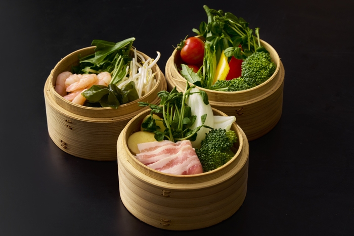 骨付きスペアリブ/コンテチーズとほうれん草のココットオムレツ/ミニハンバーガー/グリーンピースとベーコンのクリームペンネ/スパゲティ ペスカトーレ/ピッツァ マルゲリータ/しらすと大葉のピッツァ/お好みせいろ蒸し(豚バラ肉・海老・キャベツ・水菜・もやし・オクラ・パプリカ・しめじ・点心・新じゃが芋・玉ねぎ・人参・わかめ・ブロッコリー・豆苗・スナップエンドウなど)