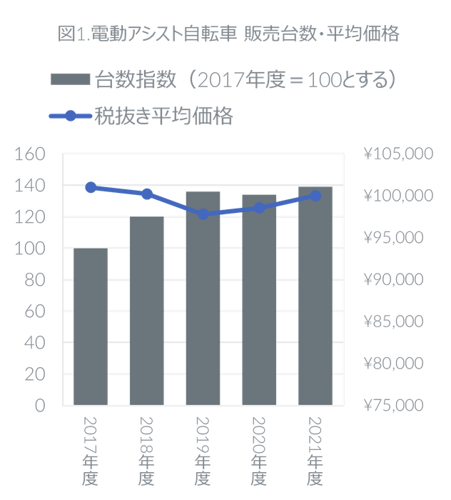 電動アシスト自転車の平均価格は上昇傾向にあり、2021年度の税抜き平均価格は100,001円と前年度から1%上昇した。特にホーム車、ミニサイクルの価格が上昇しており、ホーム車は104,177円と2%、ミニサイクルは92,450円と2%それぞれ前年度から上昇した。その結果、販売金額は前年比5%増と堅調であった。