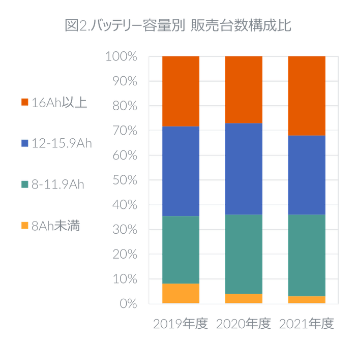 ・16Ah以上のバッテリー容量を搭載した製品の構成比が拡大し、32%を占めた。