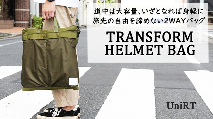 UniRTとして初めての商品である「トランスフォームヘルメットバッグ」は1つのバッグをシーンに合わせて使いまわせる、普段使い出来るクオリティのパッカブル式トランスフォームバッグを作りたいと思い企画しました。