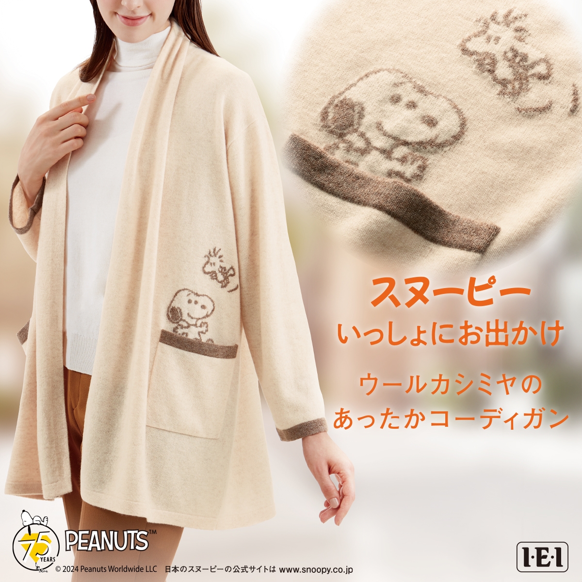 <スヌーピー いっしょにお出かけ>ウールカシミヤのあったかコーディガンは、I・E・I オリジナルショップにて販売いたします。