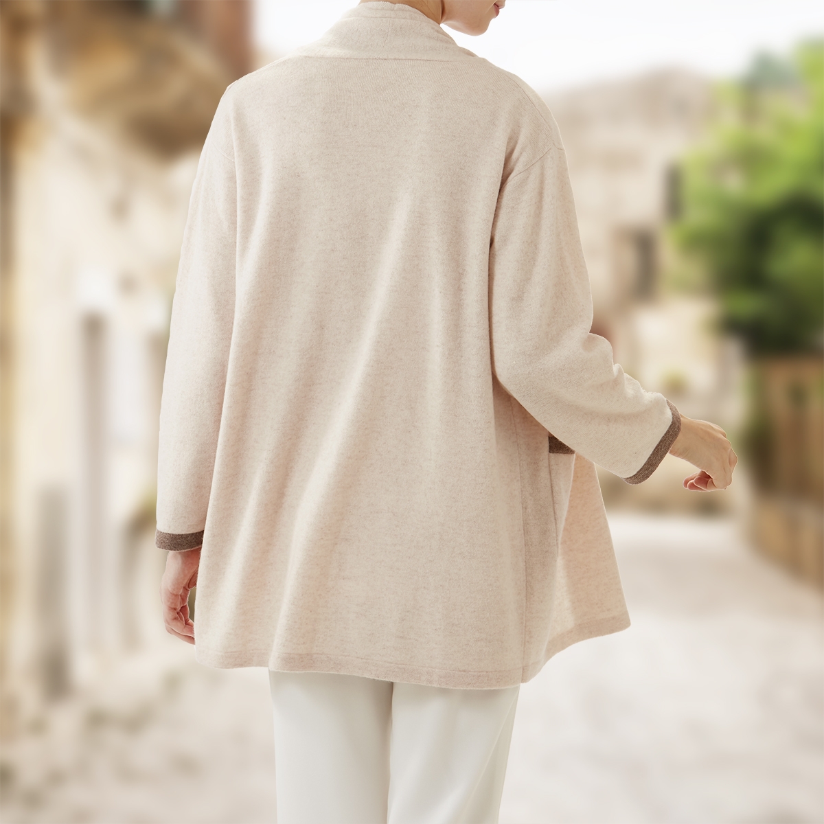 コーディガンはナチュラルな印象のベージュを基調に、袖口やポケットのアクセントとして上品なモカカラーを効かせたデザイン。