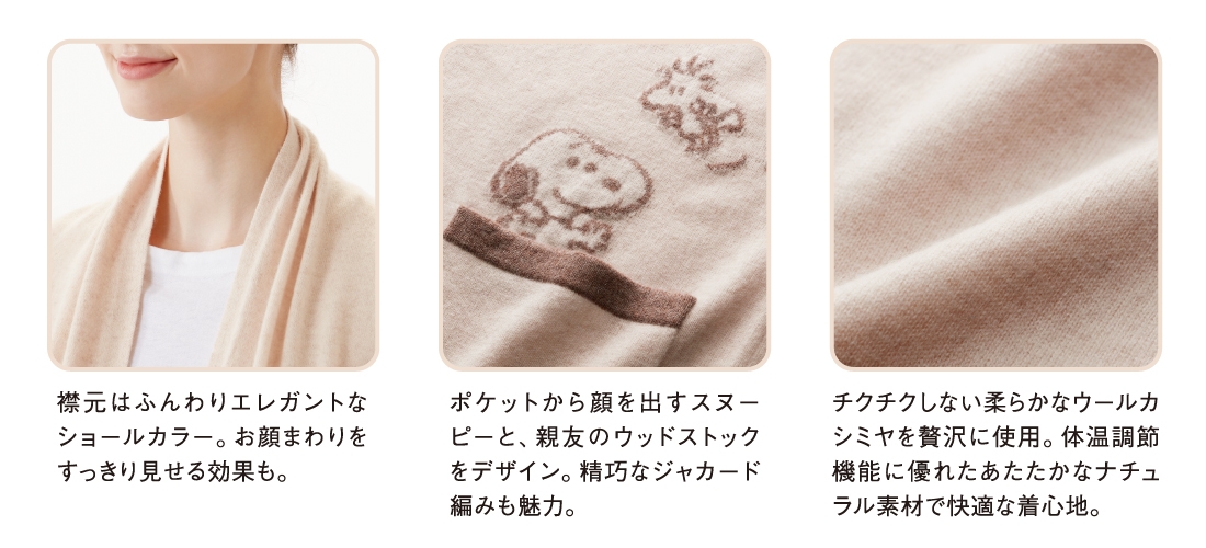 PEANUTSのコミック誕生75周年記念。<スヌーピー いっしょにお出かけ>ウールカシミヤのあったかコーディガン、新発売!