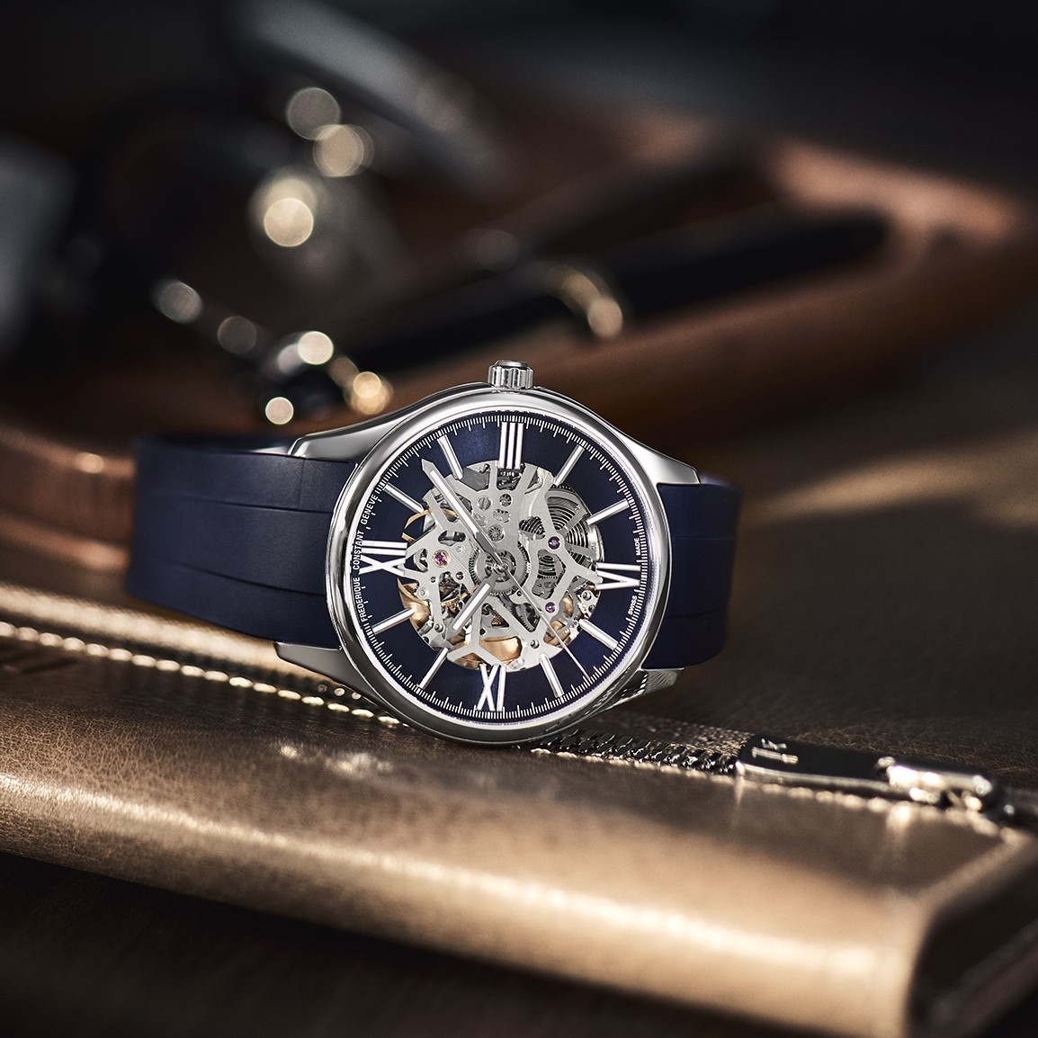 クラシカルエレガントに“モダン”な印象のスケルトンのエッジを添えた日本限定モデル。スケルトナイズを施したダイヤルから、幾何学的にカットアウトしたブリッジムーブメントの構造美が覗きます。ローマ数字とバーインデックスのコンビネーションにペンシル針、ストラップは肌なじみのよいソフトなラバーを採用しました。