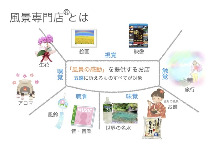 ex.「風景」の写真・絵画、夏の音風景として風鈴、正月の風景としてお餅販売、など五感に訴えかける「風景」の提案販売。心の原風景として伝統工芸品を企画・販売。