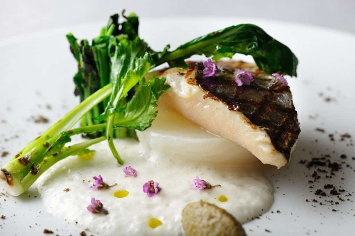岩魚をふっくらと焼き上げ、旨味が効いた岩魚の出汁を泡状にした軽やかなソースと、ふきのとうのピューレとともに提供します。付け合わせには優しい口当たりの蕪を合わせました。オリーブとアンチョビのパウダー、紫蘇の香りがアクセントとなり、岩魚の旨味を引き立てます。