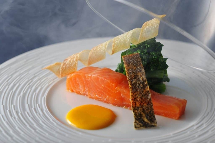 低温でゆっくりと加熱した虹鱒に、まろやかな甲州味噌を合わせたザバイオーネソースを添えた一品です。蓋を開けるとスパイシーな香りを持つジュニパーベリーの燻製の香りが広がります。爽やかな香りとすっきりとした風味が、虹鱒の旨味をより引き立てます。付け合わせには、春の味わいの菜の花、パリッとした食感の虹鱒の皮を合わせました。